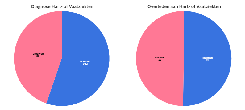 De visualisatie hierboven toont aan dat er meer mannelijke dan vrouwelijke hart- en vaatziektepatiënten zijn, maar dat deze verhoudingsgewijs verschuift bij de overledenen aan hart- en vaatziekten. Dit kan aantonen dat vrouwelijke hart- of vaatziektepatiënten meer risico lopen om hieraan te komen overlijden.