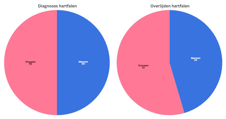 De visualisatie hierboven toont aan dat mannen en vrouwen ongeveer even vaak gediagnostiseerd worden met hartfalen, maar vrouwen overlijden er vaker aan. Een vrouw heeft dus een grotere kans om te overlijden aan hartfalen dan een man.